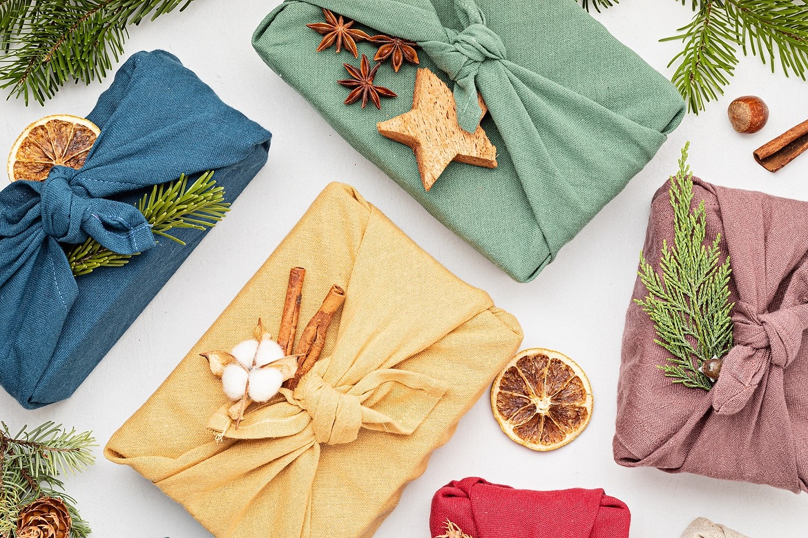 Slå in dina klappar (tex en bok) i en tröja, eller en kökshandduk - och låt därmed även omslagspapperet bli en del av presenten. Det är ett kul och miljövänligt alternativ och en vanlig inslagningstradition i Japan. Dekorera gärna med naturliga saker som kanelstänger och torkade apelsinskivor.