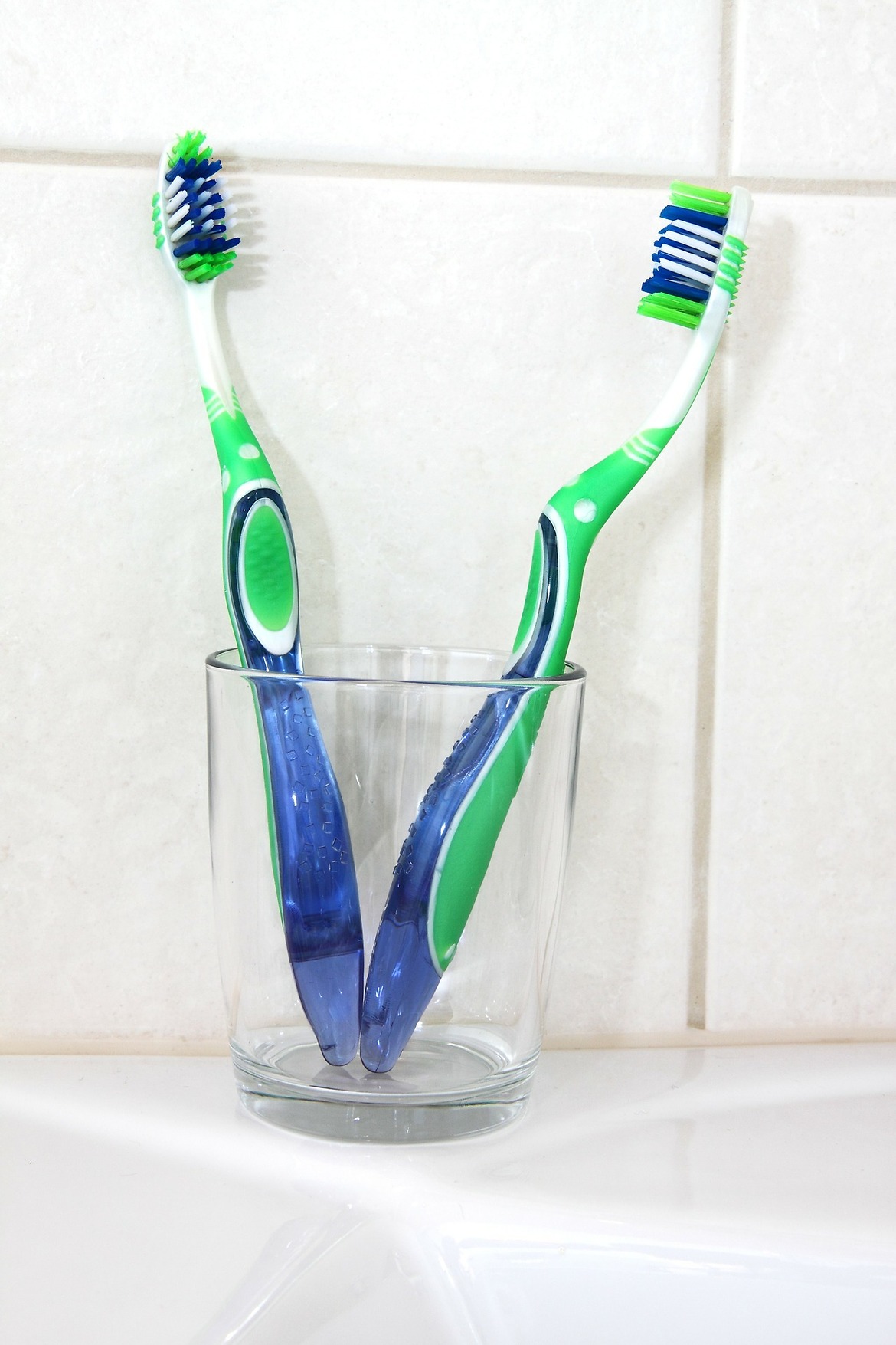 2) Ställ tandborstar och tandkräm i ett glas eller lämplig tandborstmugg. (Som du ser till att diska ofta! De blir äckliga väldigt fort!)